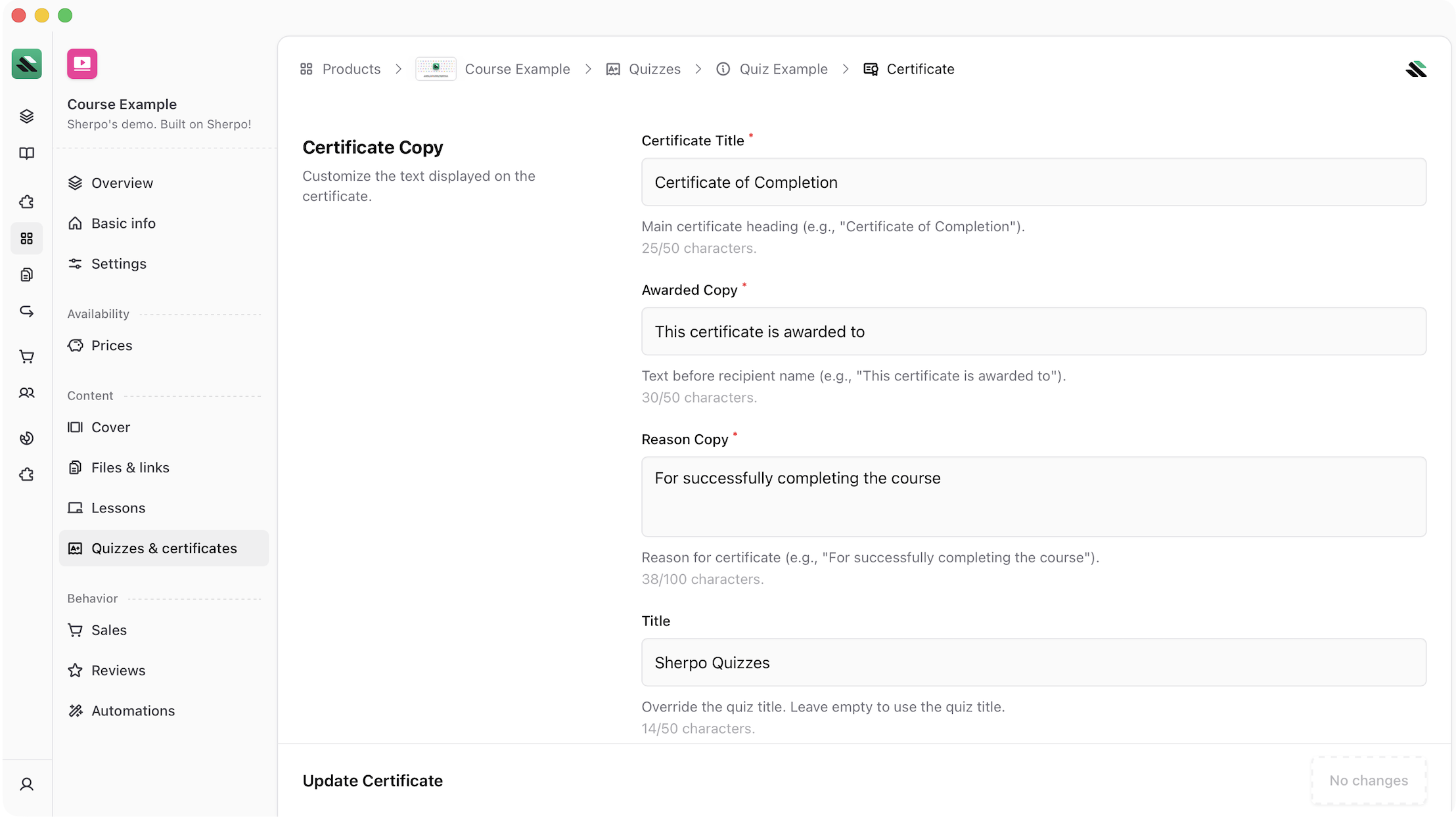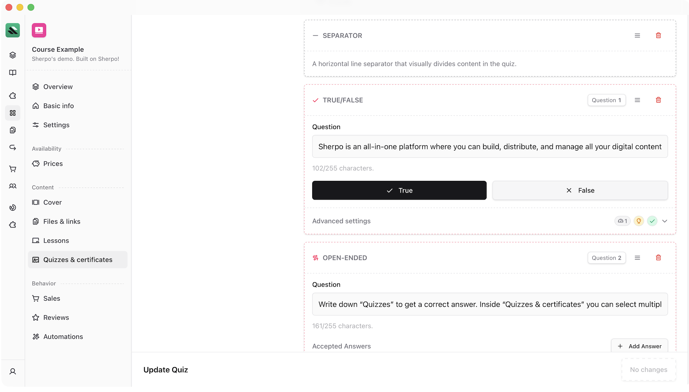 Upload lessons, add files, quizzes, certificates and publish a stunning course site. All on Sherpo.
