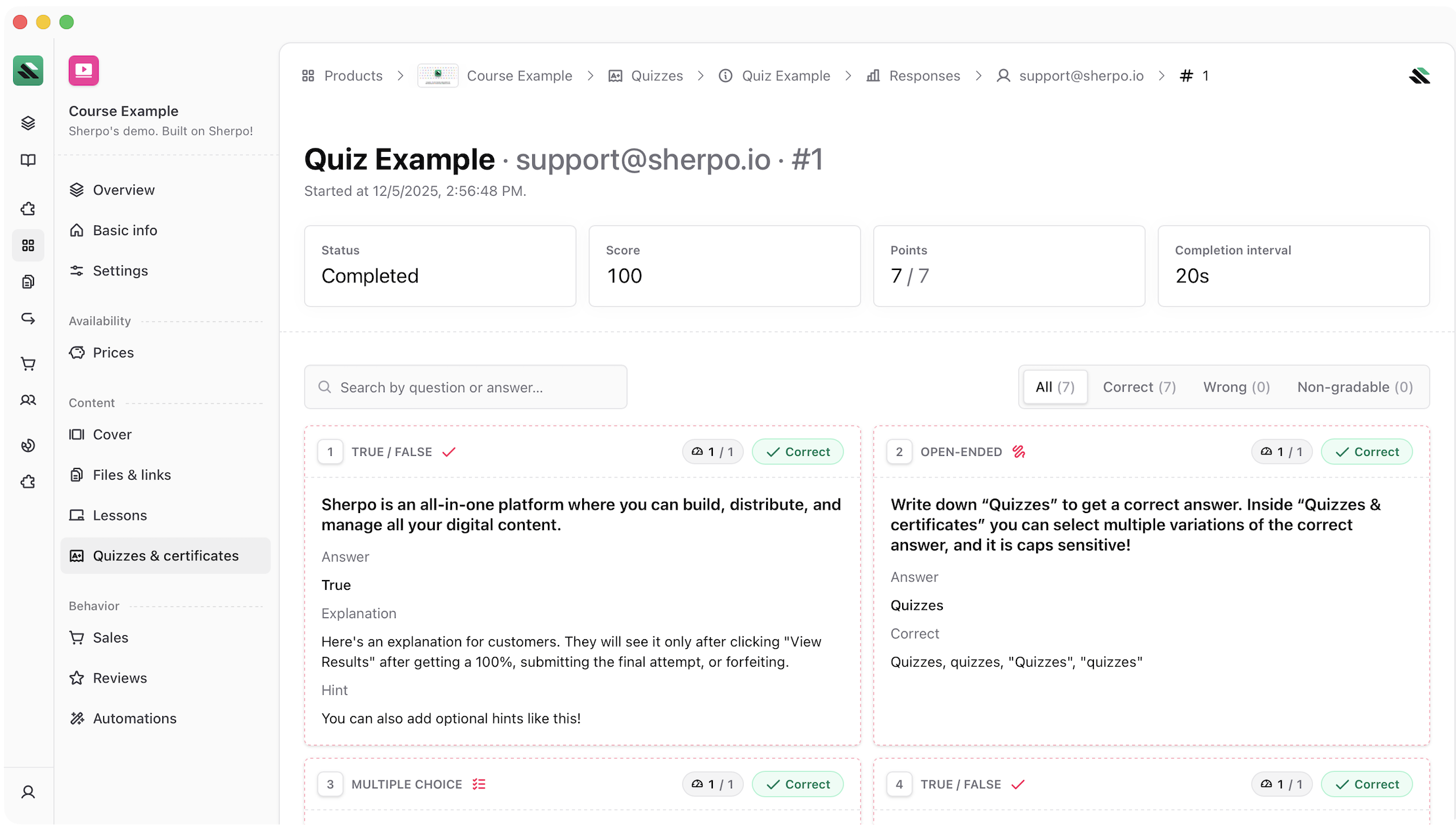 Upload videos, embedded slides, and additional files. Write a description. Include quizzes. Track student progress with course completion tracking. Sherpo has everything you need, and more.